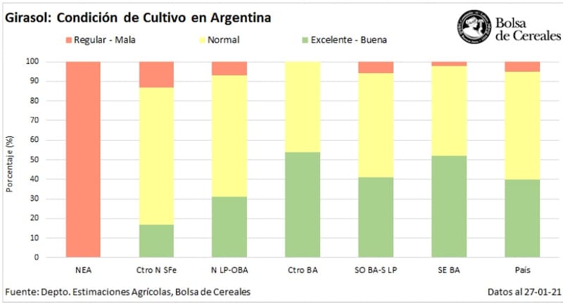 Por su parte, en girasol, que se encuentra en etapa de cosecha, la condición del cultivo "mejoró significativamente" tras las lluvias de los últimos 20 días, indicó la Bolsa de Cereales, "sosteniendo las expectativas de rendimiento para alcanzar la proyección de producción de 2,9 millones de toneladas", precisó.