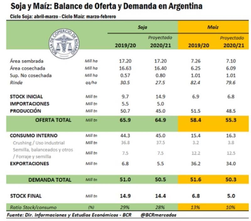 Y ayer se sumó la Bolsa de Cereales de Buenos Aires, con una doble reducción, la soja a 44 millones de toneladas y el maíz a 45 millones, ambos con bajas de las 46 millones de toneladas previstas con anterioridad. Entre ambos cultivos terminarán produciendo 13,2 millones de toneladas menos que en la campaña 2019/20.