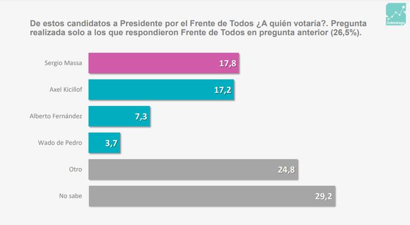 En cambio, en el Frente de Todos, los resultados son mucho más parejos. El ministro de Economía Sergio Massa y el gobernador de la provincia de Buenos Aires, Axel Kicillof, serían los dos referentes más votados, con muy pocos votos de diferencia.