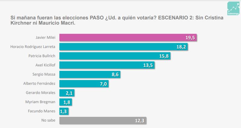 El estudio elaborado por Solmoirago también plantea un escenario sin Macri y Cristina Kirchner como candidatos. En este caso, la sorpresa es que el economista Milei se ubicaría como el candidato más votado en las PASO, aunque Rodríguez Larreta (dentro del margen de error) le pisaría los talones. En este escenario, la presidenta del PRO, Patricia Bullrich lograría colarse en el podio.
