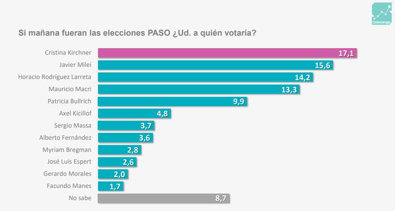 ¿Conclusión? En las PASO, los tres referentes más votados serían Cristina Kirchner (17,1%), Javier Milei (15,6%) y Horacio Rodríguez Larreta (14,2%).