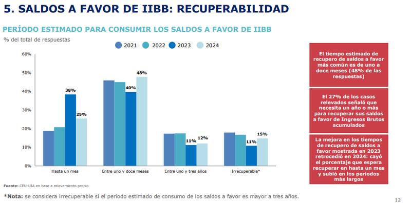 De los cuales, el 40% es originado en provincias donde las empresas no tienen establecimientos, a raíz de que algunas retienen ingresos brutos más allá de sus límites territoriales. Y que en términos del tiempo de recupero, para la mayoría, requiere entre 1 y 12 meses, mientras que un 14% considera que el saldo es irrecuperable.