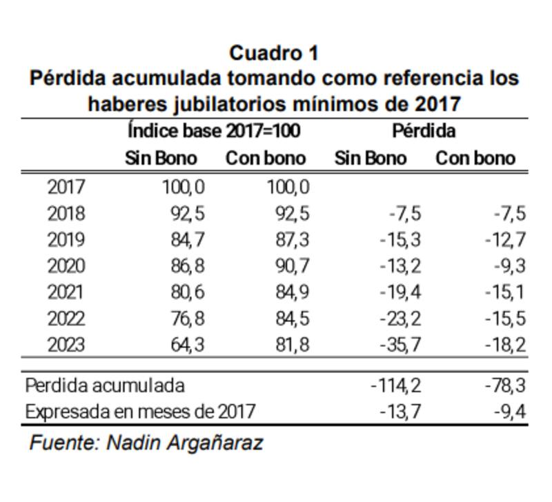"Un jubilado con la mínima que recibió bonos llegó a fines de 2023 con una pérdida acumulada de $ 1.924.878 en sus espaldas. Perdió 9,4 haberes en los últimos 6 años. Una compensación para 6 millones de jubilados tendría un costo fiscal equivalente a u$s 14.000 millones", amplió Algarañaz.