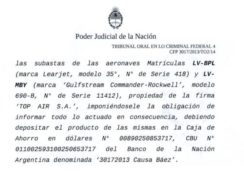 Con fecha del 8 de marzo, el juez Néstor Costabel le envió una carta al titular de la Agencia de Administración de Bienes del Estado (AABE), Ramón Lanús, para "materizar" las subastas de los dos aviones: el Learjet matrícula LV-BPL y un Commander-Rockwell, modelo 690-B, matrícula LV-MBY. Lo recaudado deberá ser depositado en una caja de ahorro en dólares del Banco Nación denominada "Causa Báez".