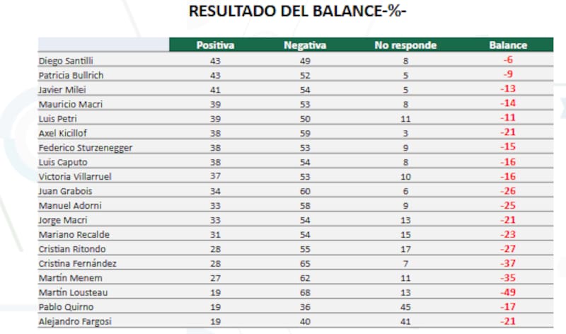 En el plano político, el estudio marca movimientos relevantes: Diego Santilli y Patricia Bullrich lideran la imagen positiva con 43%, mientras que Javier Milei alcanza 41%, tres puntos más que el mes anterior.