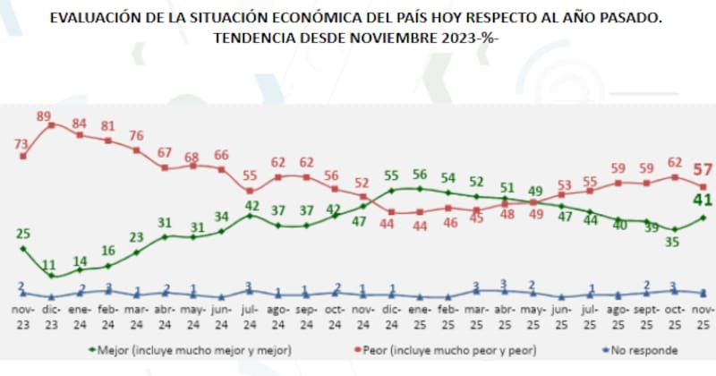 Según el informe de D’Alessio IROL y Berensztein, la percepción positiva de la situación económica subió a 41%, recuperando seis puntos frente a octubre (35%). Sin embargo, el 57% sigue creyendo que la situación es peor que la del año pasado.
