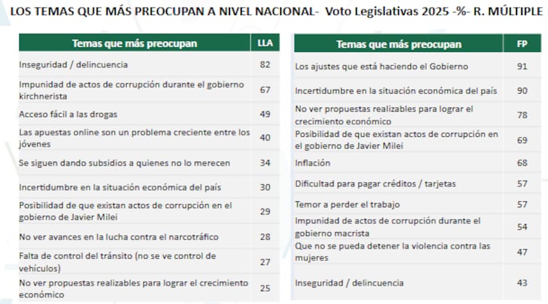 El análisis por voto también es revelador: quienes eligieron a LLA mencionan como principales temores la inseguridad (82%), la corrupción kirchnerista (67%) y el acceso a las drogas (49%).