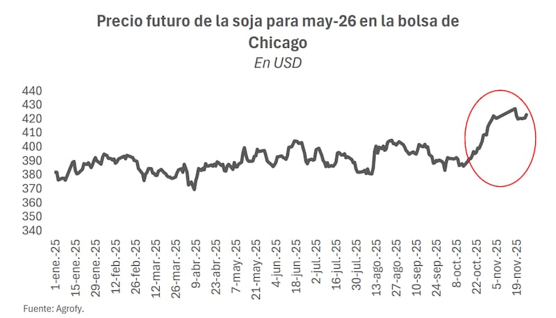 El futuro de la soja para mayo de 2026 en la Bolsa de Chicago pasó de un promedio de u$s/Tn 390 entre enero y septiembre a u$s/Tn 420 en los últimos días, lo que refleja un alza del 8%.