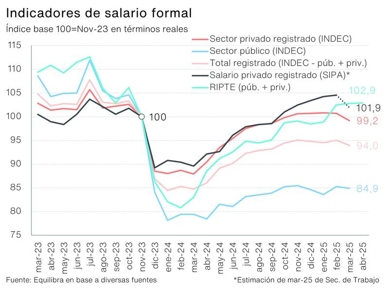 "Si bien RIPTE arrojó 4 meses consecutivos de suba por encima de la inflación, el resto de los indicadores mostró un amesetamiento en la primera parte de 2025 con caída en marzo", explicó Gonzalo Carrera, economista de equilibra en X y sumó otros indicadores al debate.
