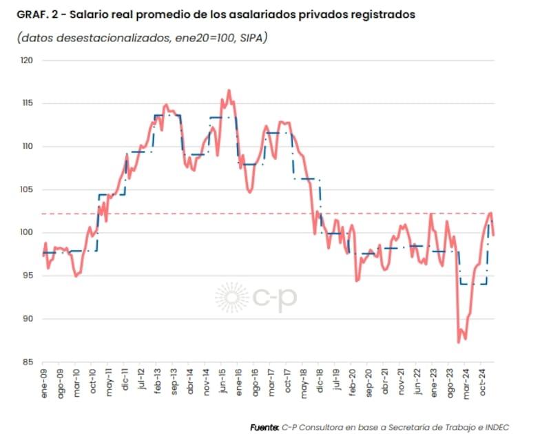 En ese sentido, explicó que en 2024, en un contexto de baja de la inflación, el Gobierno ponía una pauta salarial que iba en línea; esa dinámica muestra un quiebre en marzocuando el IPC vuelve a mostrar un alza y se genera un proceso de retracción salarial.