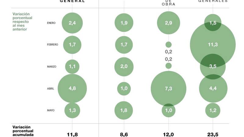 En el análisis por ítem de obra para el mes de mayo se observan los mayores aumentos en “Yesería (7,3%), “Pintura" (5,6%) e "Instalación eléctrica" (4,9%) y menores aumentos en “Estructura (0,8%), "Albañilería" (0,5%) y "Otros trabajos y gastos" (0,2%).