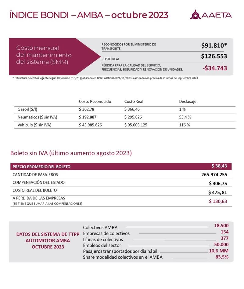 Según el Índice Bondi, en octubre los pasajeros pagaron $ 38,43 en promedio en el Área Metropolitana de Buenos Aires (AMBA), mientras que el Estado nacional otorga una compensación por cada usuario de $ 306,75. Eso suma unos $ 91.810 millones mensuales que reciben los colectivos; no obstante, el costo real es de $ 475,81, por lo que prorrateado por todos los viajes suma $ 126.553 millones; es decir, que las empresas dejan de percibir unos $ 130,63 por pasajero o $ 34.743 millones en total.