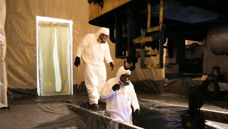 Los trabajadores deben cubrirse con mamelucos descartables y máscaras para filtrar el oxígeno que respiran.