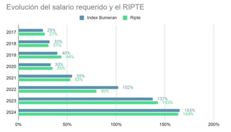 Un informe privado sobre el mercado laboral argentino elaborado por Bumeran reveló que el salario requerido aumentó 165,31% en 2024, dato que lo ubica por encima de la inflación acumulada del mismo periodo (117,8%) y del último índice RIPTE publicado, que es de un 163,70%.