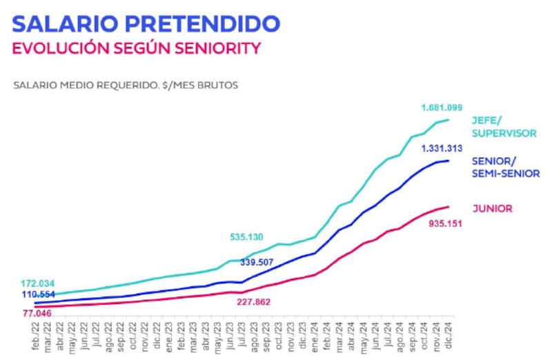 En ese mes, el salario requerido para los puestos de Jefe / Supervisor es de $1,681,099, para el segmento Semi-Senior y Senior es de $1,331,313 y para los puestos Junior es de $ 935,151.