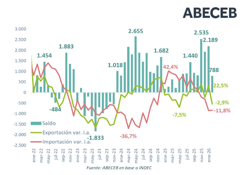 Con este resultado, el país acumula 28 meses consecutivos de superávit comercial. En el primer trimestre de 2026, el saldo totalizó u$s 5508 millones, marcando una diferencia profunda frente a los u$s 1061 millones registrados en el arranque del año pasado.