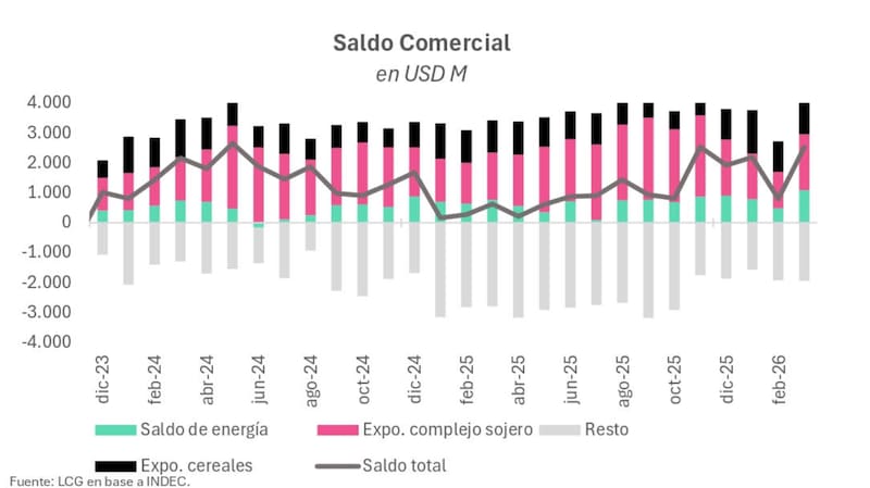 Según los últimos datos publicados por el Indec, marzo cerró con un superávit de u$s 2523 millones. Esta cifra no solo representa el mayor valor para este mes en los últimos 16 años, sino que multiplica casi por cuatro el saldo obtenido en el mismo periodo de 2025, según destacó la consultora Abeceb.