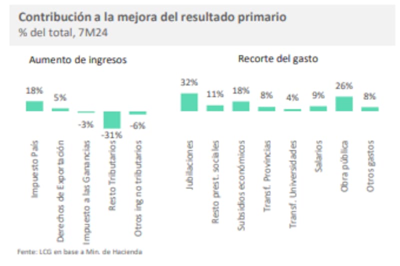 Además, explicaron que "el gasto en jubilaciones cayó 'apenas' 15% anual real contra 26% en los 6 meses previos, producto de los cambios en la fórmula de movilidad. Y el pago de subsidios se recortó 15% anual real vs 40% anual en previa".