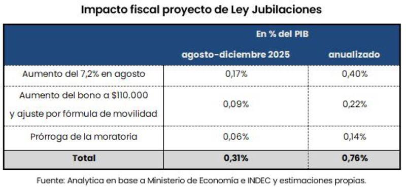 La prórroga de la moratoria por dos años más, en los últimos cinco meses del año implicaría un gasto público de 0,06%/PBI, lo que anualizado daría 0,14%. En cuanto a los proyectos de los gobernadores, estiman que sería 0,18%/PBI y 0,35% respectivamente. Lo que en total gasto de 0,31%/PBI para los meses que restan 2025y 1,11%/PBI por añolejos del 2,5% que alerta el Gobierno.