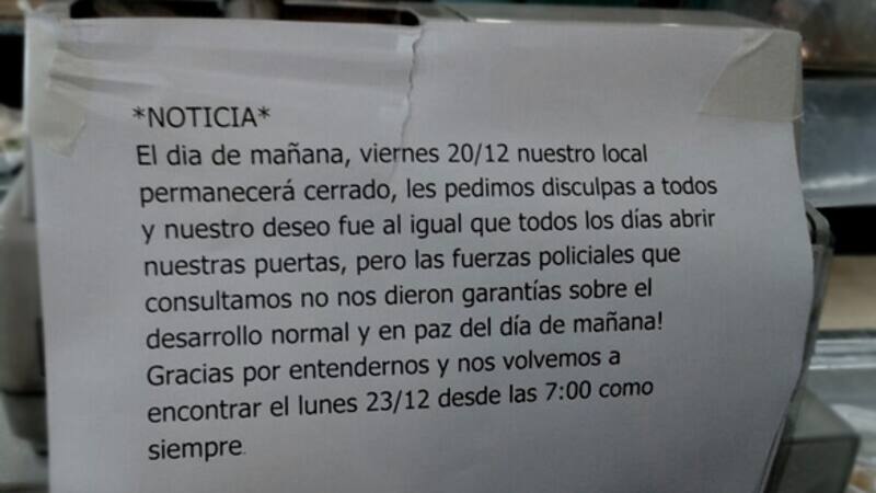 En cuanto a los supermercados chinos, la presidenta de la Cámara Empresarial de Desarrollo Argentino y Sudeste Asiático, Yolanda Duran, informó que la mayoría de esos comercios bajarán sus cortinas esta tarde y permanecerán cerrados mañana por miedo a los saqueos.