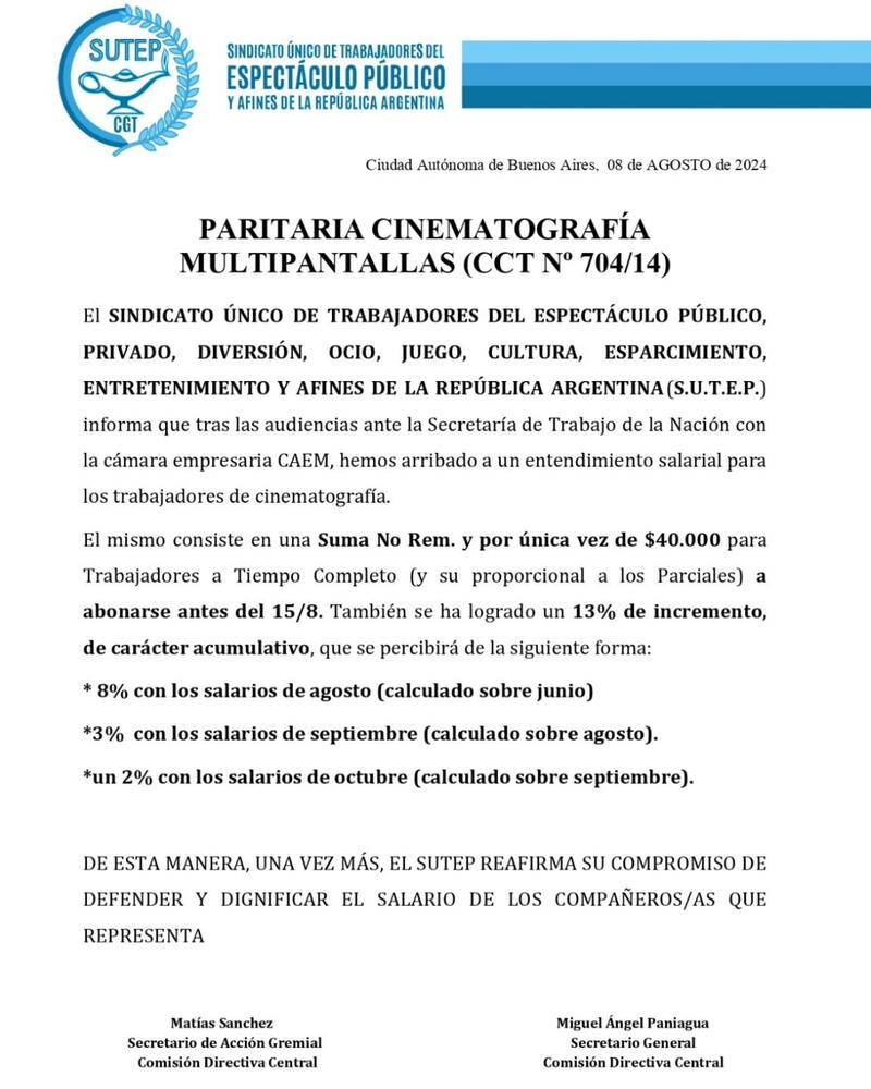 El Sindicato Único de Trabajadores del Espectáculo Público (SUTEP) cerró un nuevo acuerdo paritario con la Cámara Empresaria de Exhibición Multisalas (CAEM) que beneficiará a un determinado grupo de trabajadores, tras una audiencia con la Secretaría de Trabajo.