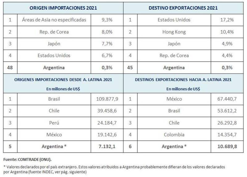 En materia de importaciones, la Argentina le compró al gigante asiático por u$s 10.689 millones en 2021, muy por debajo de México (u$s 67.440 millones); Brasil (u$s 53.612 millones) y Chile (u$s 26.292 millones).