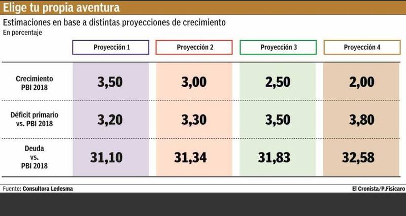 El Gobierno apuesta a reducir el déficit primario a 3,2% del PBI este año. Según calculó Caamaño Gómez, suponiendo el resto de las variables constantes, un crecimiento de la economía de 3% se traduce en un rojo primario de 3,3%. Y llegaría a 3,8%, en caso de un aumento del PBI de 2% en 2018.