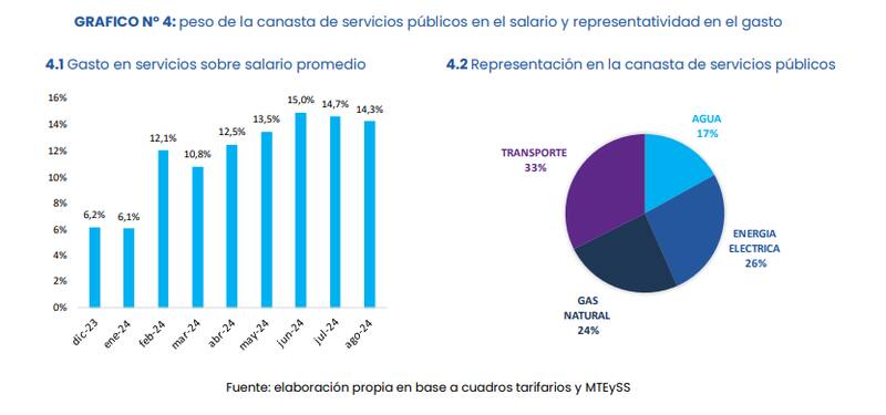 Con respecto a diciembre de 2023, el costo de la canasta total se incrementó un 380% a partir de las actualizaciones de tarifas de transporte (enero y febrero), energía eléctrica (febrero, junio y agosto), gas natural (abril, junio y agosto) y agua (abril, julio y agosto). En la desagregación por servicio que realiza el IIEP se observa que el incremento más importante fue en la tarifa de gas natural, con un aumento del 1.132% respecto a diciembre de 2023. El gasto en transporte subió un 484%, en agua un 267% y en energía eléctrica, un 204%.