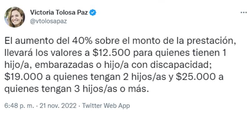 "Por indicación del presidente de la Nación, Alberto Fernández, hoy nos reunimos con el ministro de Economía de la Nación, Sergio Massa, para avanzar en un aumento del 40% en la Prestación Alimentar, también conocida como Tarjeta Alimentar", anticipó la funcionaria en Twitter, días atrás.