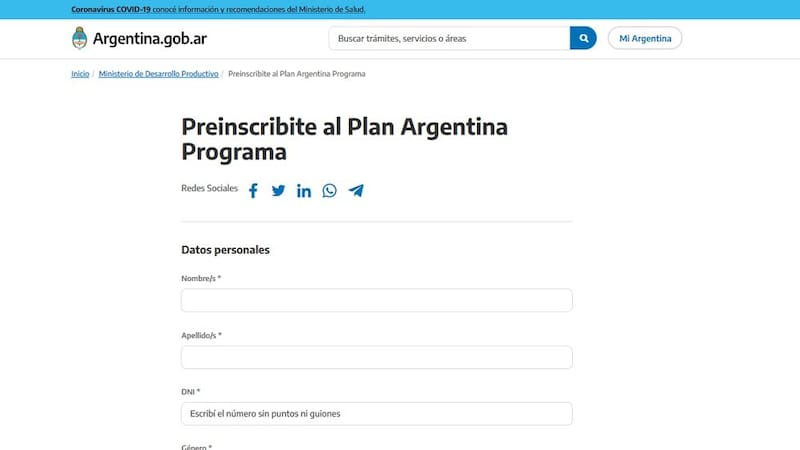 El Ministerio de Desarrollo Productivo junto con el Banco Nación de la República Argentina, a través de la tienda BN+, habilitarán una nueva etapa de inscripción del programa Argentina Programa, el beneficio que estipula un aporte no reembolsable de hasta $ 100.000 para financiar la compra de computadoras, gastos de conectividad o transporte.