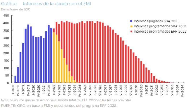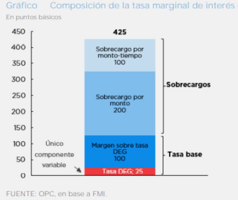 Los sobrecargos aplican cuando el saldo deudor supera el límite equivalente a 187,5% de la cuota del país en el FMI. "Inicialmente es de 200 puntos básicos y aplica sobre el excedente. Si el saldo persiste más de 36 meses para los Stand-by y 51 meses para los EFF, el sobrecargo se incrementa otros 100 puntos, hasta los 300 puntos básicos", detalla el informe de OPC en base a las reglas del FMI.