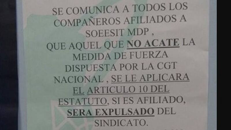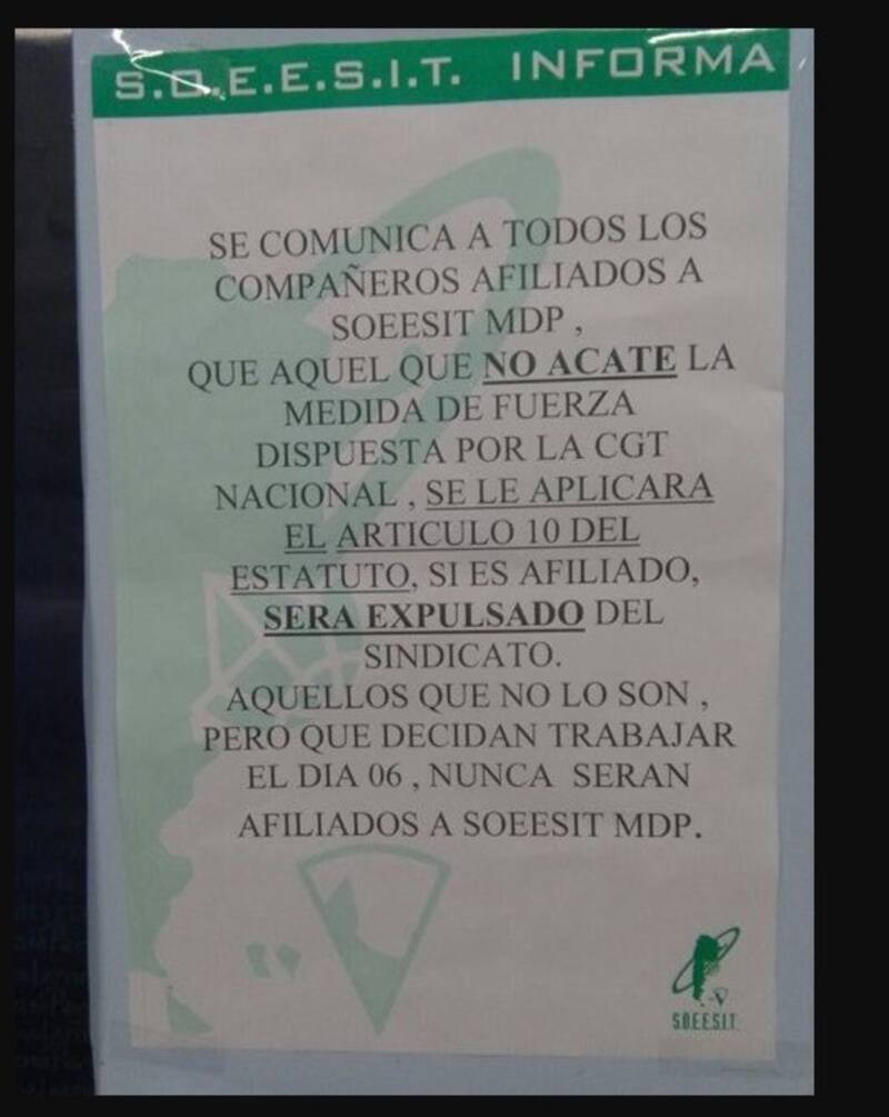 “Se comunica a todos los compañeros afiliados a Soeesit Mdp que a aquel que no acate la medida de fuerza dispuesta por la CGT nacional, se le aplicará el artículo 10 del estatuto, si es afiliado será expulsado del sindicato. Aquellos que no lo son, pero que decidan trabajar el día 6 nunca serán afiliados a Soeesit Mdp“, reza el comunicado que apareció en un call center de Movistar local.
