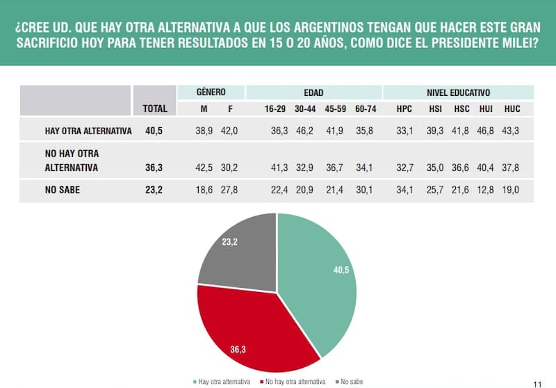 Además, y en el mismo sentido, un 40,5% asegura que hay otras alternativas para apuntar a tener una mejoría en el largo plazo, sin necesidad de seguir insistiendo con "el ajuste más grande de la historia", tal como calificó el propio Milei a su plan de gobierno.