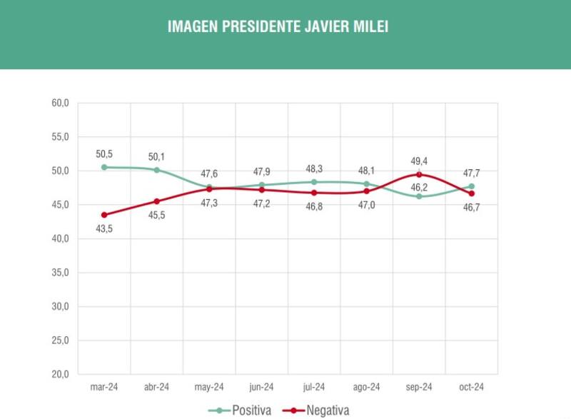 "Hay una leve mejora en la aprobación del Gobierno. El límite que encuentra esa recuperación marginal es que se consolida la noción de que la situación económica general y personal es mala", indica el informe, que muestra que el presidente libertario mejoró de septiembre a octubre su imagen positiva: la misma pasó del 46,2% al 47,7% en el décimo mes del año.