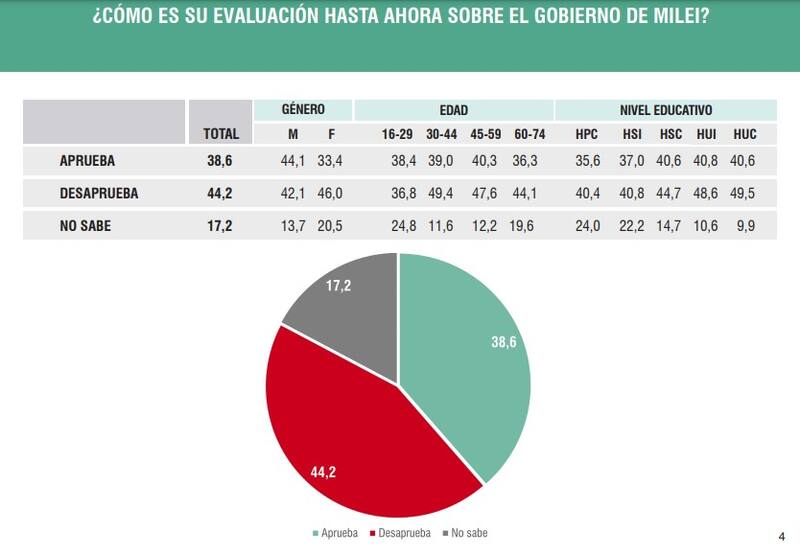 Sin embargo, una gran mayoría (44,2%) desaprueba su gestión y un 46,8% rechaza el manejo de la economía por parte del mandatario libertario.