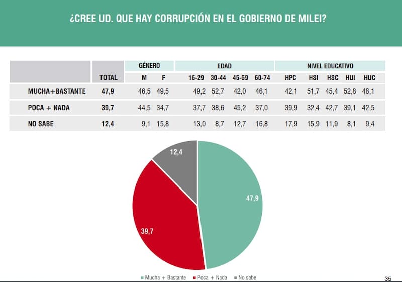"Dos mayorías consideran que Milei es insensible y que en el Gobierno hay mucha o bastante corrupción. Transcurridos casi 11 meses de gobierno, primero el quiebre y luego el estancamiento de las expectativas va envolviendo al Gobierno en sus mismos términos y diferenciales propios:´corruptos y además insensibles´", indicó el informe.