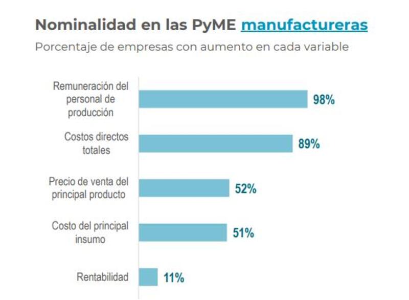 En tanto, los resultados reflejaron un retraso en los precios de las pyme industriales frente a sus costos lo que genera tensiones en la rentabilidad. Mientras que el 90% de las empresas tuvo subas en sus costos, solo la mitad registró aumentos en sus precios.