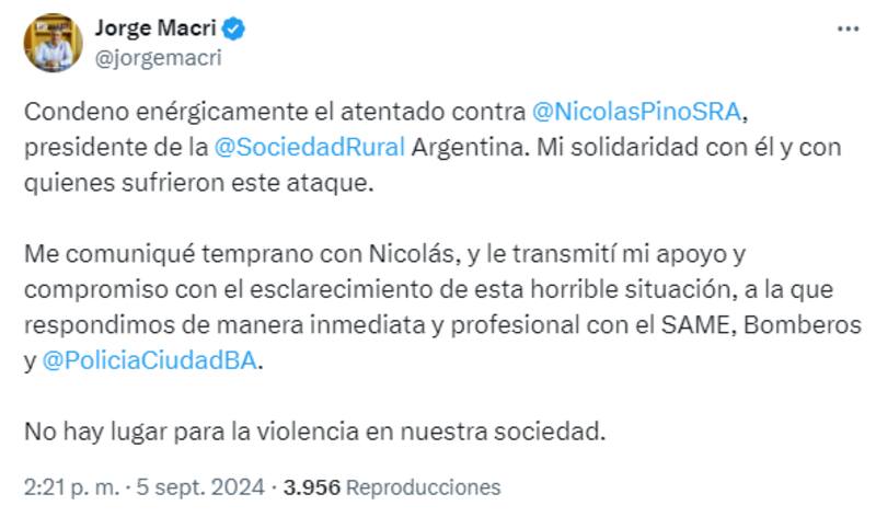 Por su parte Jorge Macri, jefe de Gobierno porteño, expresó en su perfil de la red social X (ex Twitter): "Condeno enérgicamente el atentado contra Nicolás Pino, presidente de la Sociedad Rural Argentina. Mi solidaridad con él y con quienes sufrieron este ataque".