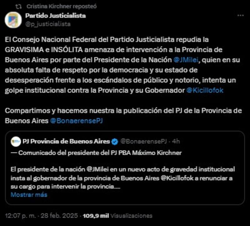 En este escenario, la última palabra en sumarse fue la de Cristina Kirchner, quien salió en apoyo del gobernador ante la última embestida del Presidente. Más temprano, Milei le pidió a Kicillof que renuncie y que lo deje "intervenir" la provincia de Buenos Aires.
