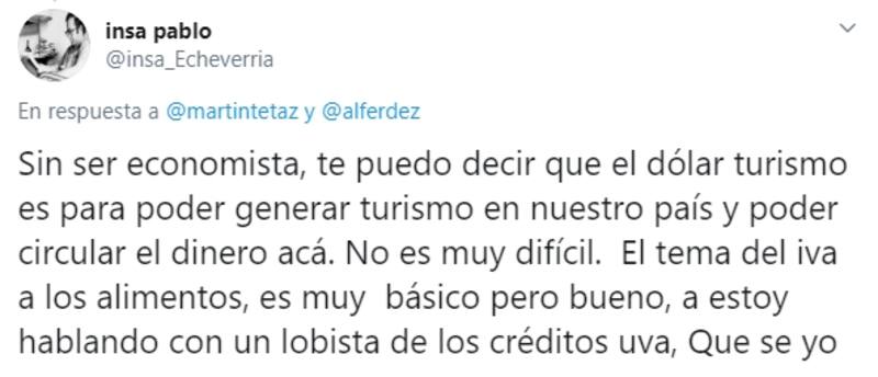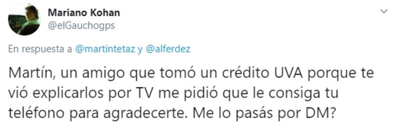En ese sentido, aprovechó su cuenta personal de Twittter (@martintetaz) para responderle a Fernández con un polémico tuit en el que aprovechó para plantear un par de quejas respecto a las decisiones económicas implementadas desde el inicio de su gestión.