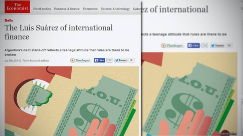La mordida del astro futbolístico uruguayo Luis Suárez al italiano Giorgia Chiellini, en el Mundial Brasil 2014 sigue dando vueltas en los medios y ahora el semanario The Economist es quien apela a la figura del jugador para criticar a la economía argentina bajo el título "Argentina es el Luis Suárez de las finanzas".