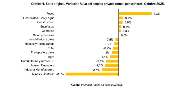 Al analizar el desempeño mensual por sectores de actividad, solamente la Pesca registró subas (+1,8%) aportando 262 nuevos empleos; a su vez, otros sectores (Enseñanza, Electricidad, Gas y Agua y Servicios Sociales y de Salud) no tuvieron variaciones.
