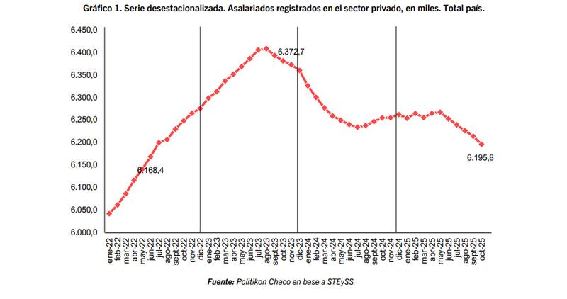 La fotografía se vuelve más crítica al ampliar el horizonte temporal. Desde noviembre de 2023, mes previo al inicio del actual gobierno, el empleo privado formal acumuló una pérdida de 176.908 puestos de trabajo, lo que representa una caída del 2,8% a nivel país. Se trata de un ajuste extendido en el tiempo, que todavía no muestra señales de reversión.