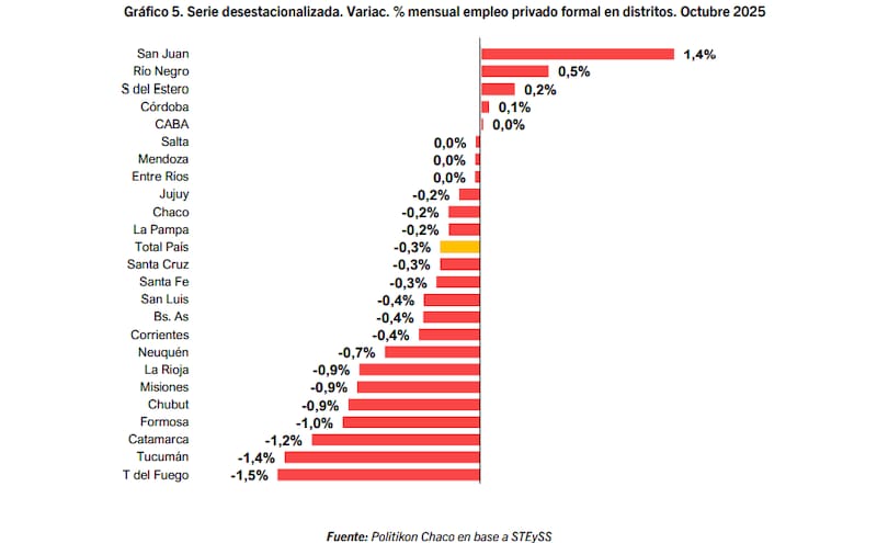 También se registraron descensos significativos en Catamarca, Tucumán y Formosa, en un contexto de persistente debilidad del empleo privado formal en la mayoría de las jurisdicciones.