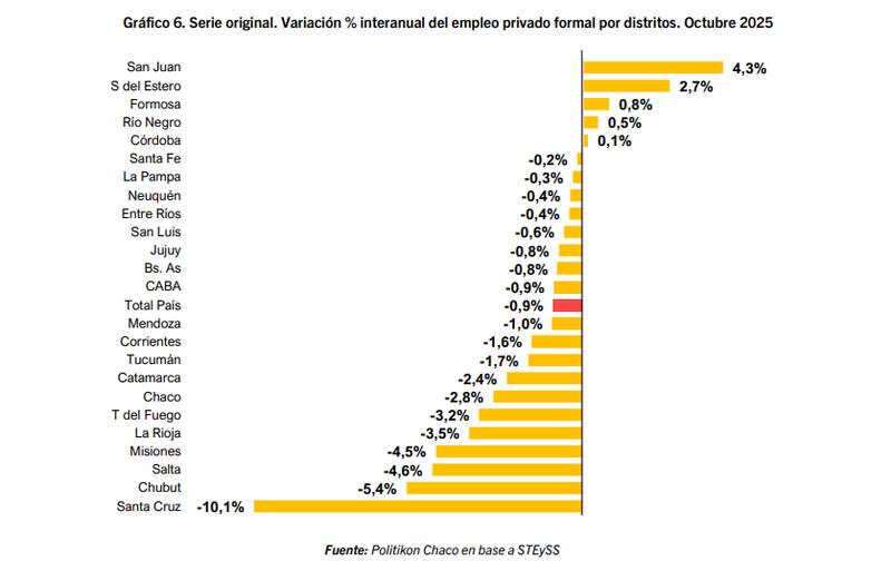 En el extremo negativo, Santa Cruz aparece como el caso más crítico del país, con una caída acumulada del 15,7% en el empleo privado formal desde noviembre de 2023, seguida por La Rioja y Tierra del Fuego, que también muestran pérdidas de dos dígitos.