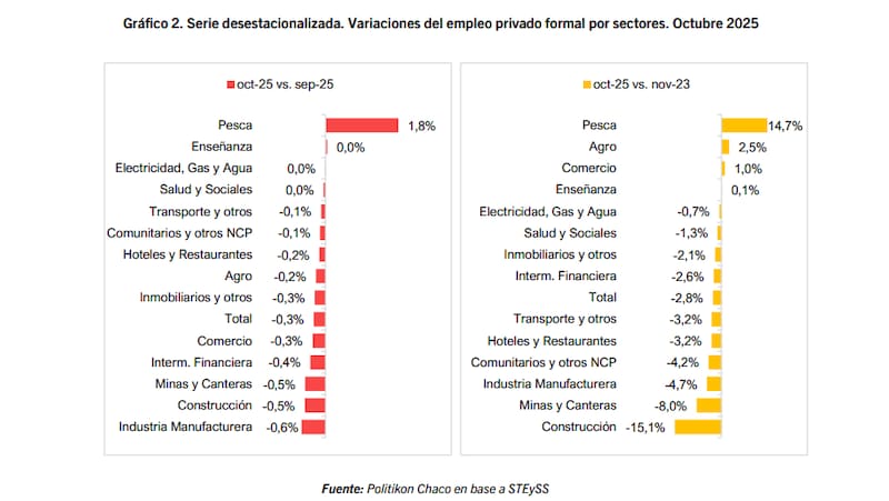 Por su parte, si se comparan los niveles de empleo de octubre 2025 respecto a noviembre del 2023 también son diez los sectores que presentan caídas y solo cuatro los que muestran mejoras. En ese marco, la Construcción sigue siendo el sector de mayor pérdida de puestos de trabajo (-15,1%) cuando el punto de comparación es el último período completo del gobierno anterior.