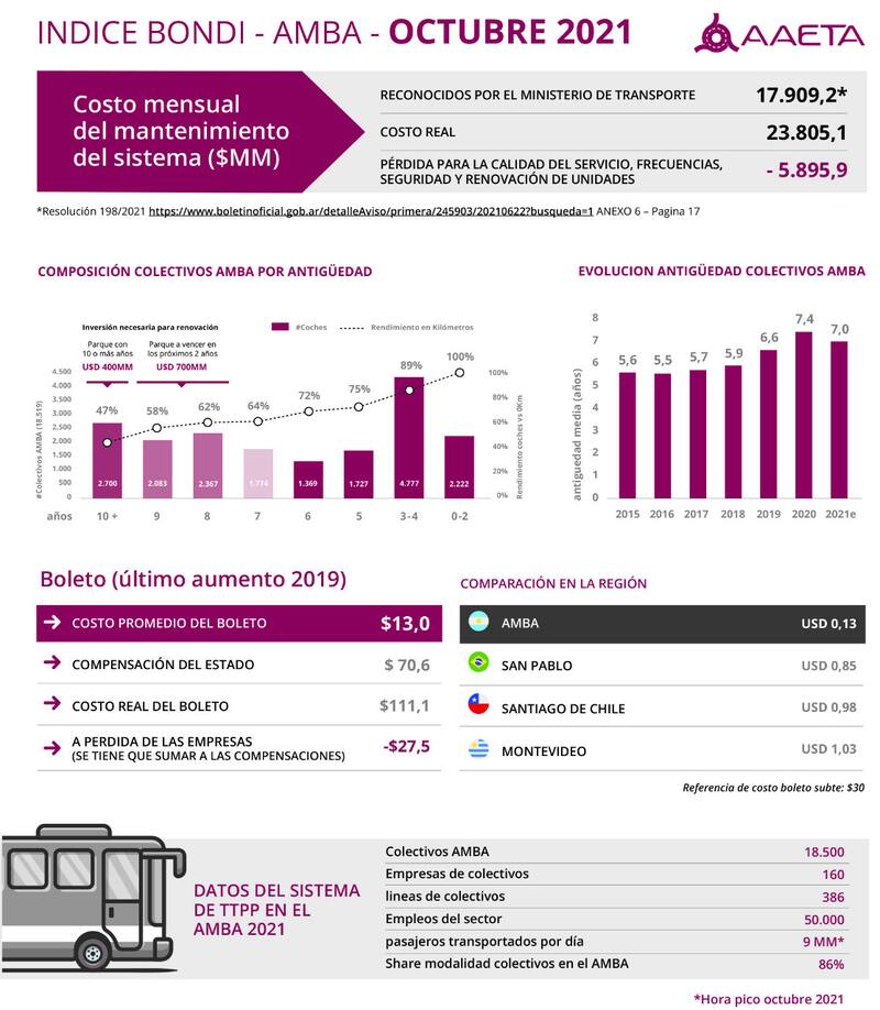 A través de la Asociación Argentina de Empresarios del Transporte Automotor (AAETA), relevaron que en octubre el costo total del sistema fue de $ 23.805,1 millones, de los cuales $ 17.909,2 millones fueron reconocidos por el Ministerio de Transporte y el resto quedó como "pérdida para la calidad del servicio, frecuencias, seguridad y renovación de unidades".