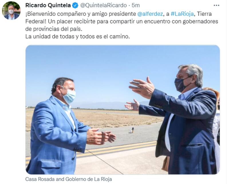 "¡Bienvenido compañero y amigo presidente @alferdez, a #LaRioja, Tierra Federal! Un placer recibirte para compartir un encuentro con gobernadores de provincias del país", escribió en su cuenta de Twitter el gobernador Ricardo Quintela.