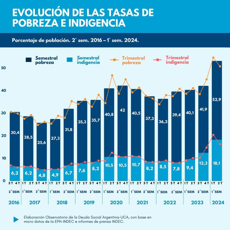 La pobreza en el primer semestre del año alcanzó al 52,9%, equivalente a casi 25 millones de argentinos, mientras que la indigencia escaló al 18,1%, más de 8 millones de personas.