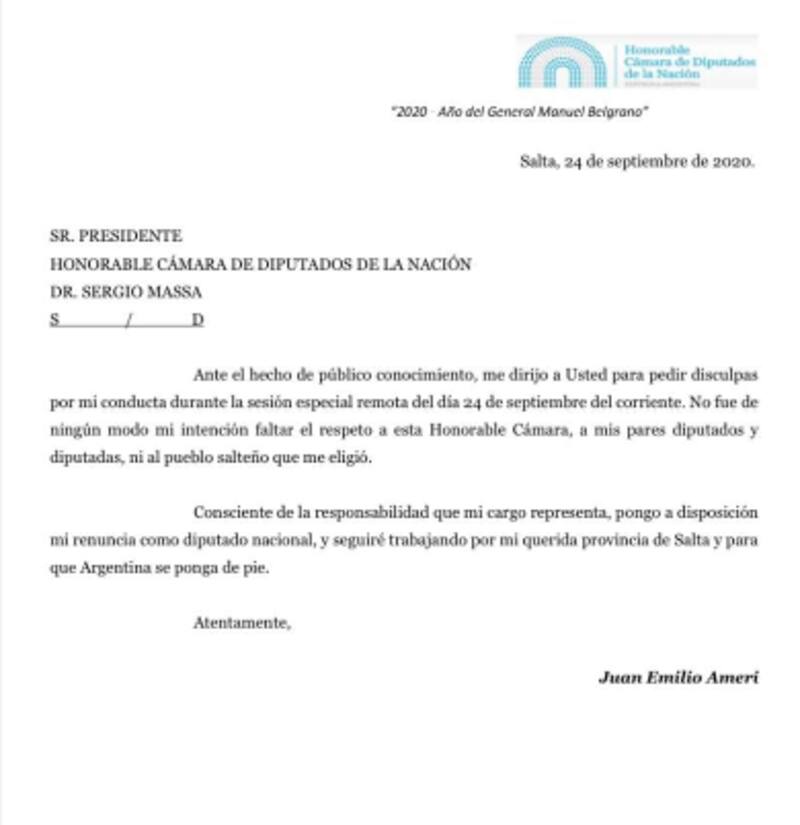 "Ante el hecho de publico conocimiento, me dirijo a usted para pedir disculpas por mi conducta durante la sesión remota del 24 de septiembre del corriente. No fue de ningún modo mi intención faltar el respeto a esta Honorable Cámara, a mis pares diputados y diputadas, ni al pueblo salteño que me votó", escribió Ameri en la misiva.